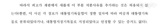 하지만 1심 재판부는 대통령실의 처분 사유 추가 요구를 받아들이지 않았다. 대통령실이 최초에 직원 명단 비공개 사유로 댔던 정보공개법 9조 1항 5·6호만 판결 대상에 포함해야 한다고 판단했다. 그러면서 재판부는 "대통령실 직원 명단이 대통령기록물법이 정한 절차에 따라 비공개 대통령기록물로 분류됐다거나, 대통령지정기록물로 지정됐다고 인정할 수 있는 증거가 없다"고도 첨언했다. 결국 '정보공개법 9조 1항 1호'는 1심 판결에 아무런 영향을 미치지 못했다. 아래는 판결문 내용 중 해당 부분.