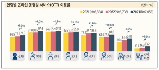이에 따르면, OTT 이용율은 77%로 전년(72%) 대비 5%p 증가했다. 연령별로는 20대(97.8%)와 10대(97.6%)의 이용률이 가장 높게 나타나는 등 연령이 낮을수록 OTT 이용률이 높았다.