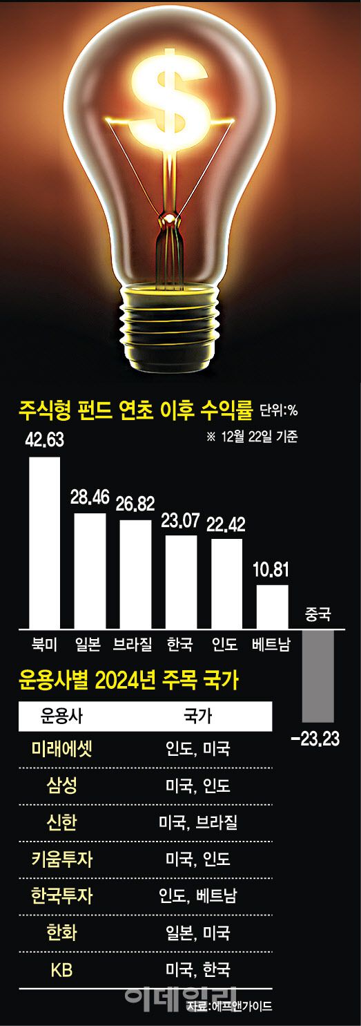 올해 국가별 펀드 성적표를 살펴보면, 에프앤가이드 22일 집계 기준 북미 주식형 펀드가 42.63%의 평균 수익률로 전체 권역에서 가장 상승 폭이 컸다. 일본은 28.46%, 브라질 26.82%, 한국 23.07%, 인도가 22.42%로 뒤를 이었다. 중국은 나홀로 ‘마이너스’(-23.23%)를 면치 못했다.