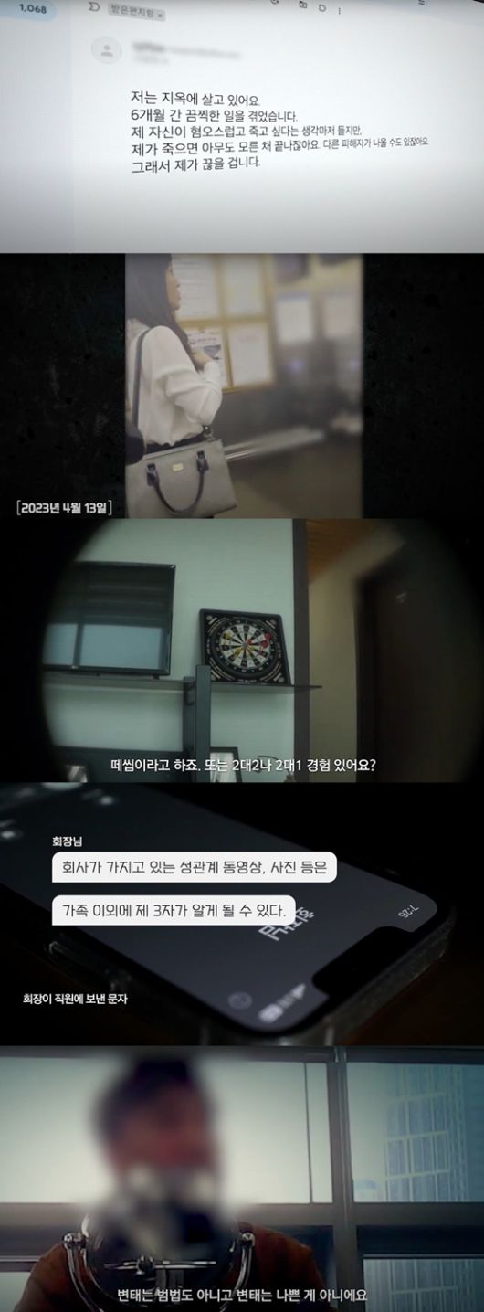 오는 29일 공개되는 웨이브 오리지널 다큐멘터리 '악인취재기; 사기공화국' 3회에서는 지속적인 직장 내 성적인 희롱과 추행, 가스라이팅을 통한 성관계 지시와 강요, 그리고 이를 불법 촬영해 협박까지 한 끔찍한 '변태 회장'의 악행을 속속들이 파헤친다.