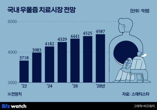 이처럼 국내 기업들이 우울증 치료제 시장에 뛰어드는 이유는 시장이 지속적으로 커지고 있어서다. 글로벌 시장조사기관 스태티스타에 따르면 국내 우울증 치료 시장은 지난해 2억8740만 달러(3700억원)에서 연평균 3.6% 성장해 2028년 3억5480만 달러(4600억원)에 달할 전망이다.