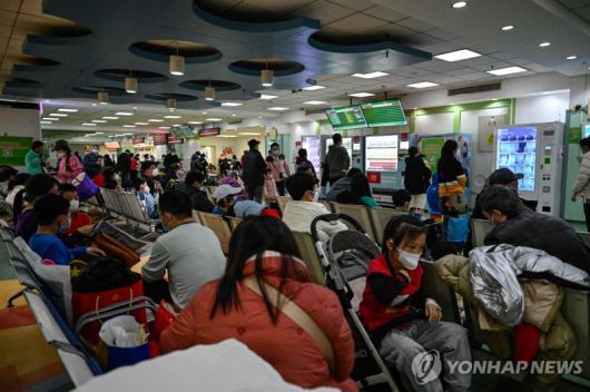 대기하고 있는 호흡기 환자들과 보호자들로 꽉 찬 중국 베이징의 한 어린이 병원. 폐렴 등 호흡기 질환이 유행했다. AFP연합뉴스 |