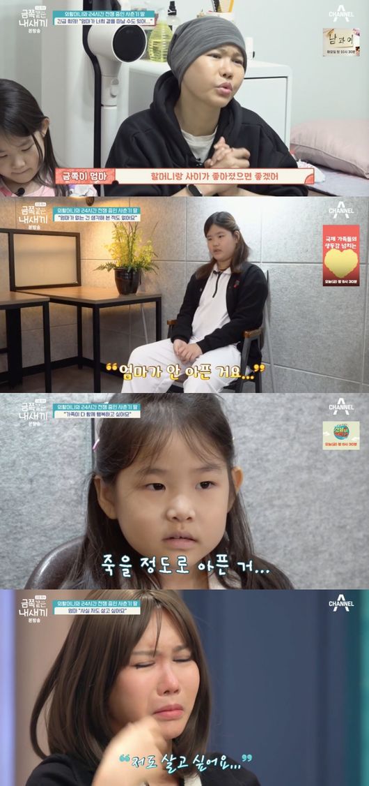 그렇다면 금쪽이 속마음은 어떨까? 금쪽이는 ‘엄마가 없다면 어떨 거 같냐’는 물음에 “엄마가 없는 건 생각해본 적 없다”라며 엄마가 죽는 게 가장 큰 걱정이라고 털어놨다. 둘째도 암이 뭔지 모르지만 죽을 정도로 아픈 거라고 알고 있었다. 이어 둘째는 소원으로 “언니가 착해졌으면 좋겠다. 엄마가 언니랑 싸우면 더 힘들어 한다”라고 덤덤하게 말했다. 이를 지켜본 엄마는 “저도 살고 싶다”라며 눈물을 흘렸다.