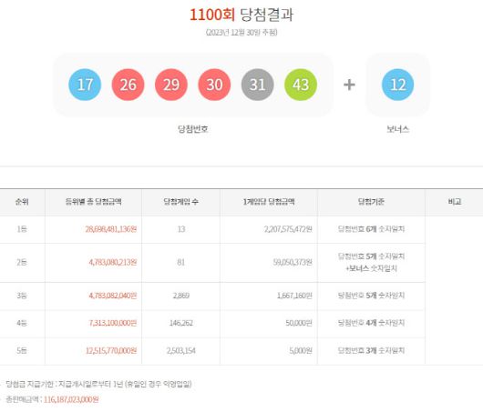 [이데일리 최영지 기자] 로또복권 운영사 동행복권은 30일 제1100회 로또 추첨 결과 ‘17, 26, 29, 30, 31, 43’이 1등 당첨 번호로 뽑혔다고 밝혔다. 2등 보너스 번호는 ‘12’다.