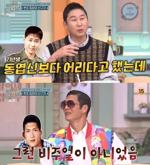 신동엽은 "나보다 나이 어리게 속여 데뷔했는데 아무리 봐도 아니더라. '몇 살 속였죠?' 물었다"고 덧붙여 웃음을 자아냈다.