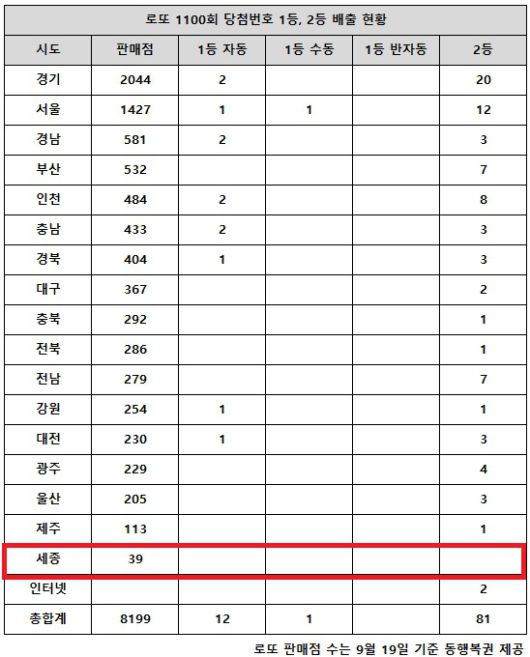 동행복권이 30일 추첨한 로또 1100회 당첨번호 조회 결과 1등은 13명, 2등은 81게임이다. 전국 17개 시도 중 세종 지역에서만 로또 고액(1,2등) 당첨 판매점이 단 한 곳도 나오지 않았다. |