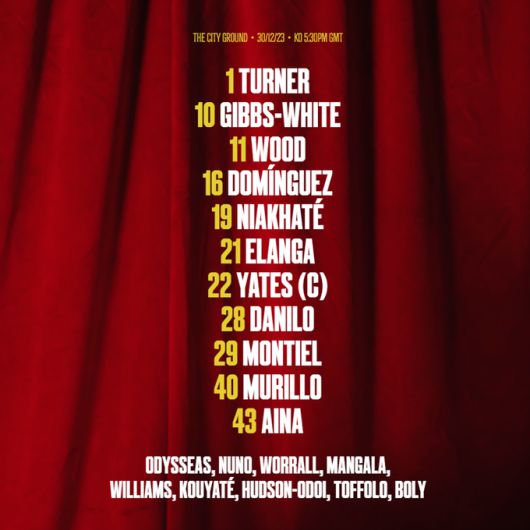 홈팀 노팅엄은 4-2-3-1 전형으로 나섰다. 맷 터너 골키퍼를 비롯해 곤살로 몬티엘, 무사 니아카테, 무릴로, 올라 아이나가 수비를 구성했다. 라이언 예이츠와 다닐루가 수비를 보호했다. 2선에 모건 깁스 화이트, 니콜라스 도밍게스, 안토니 엘랑가, 최전방에 크리스 우드가 공격에 나섰다.