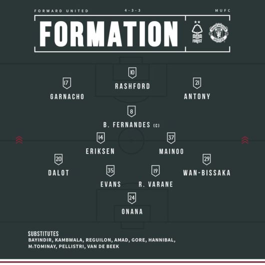 원정팀 맨유도 4-2-3-1 전형으로 맞섰다. 안드레 오나나 골키퍼를 비롯해 아론 완 비사카, 라파엘 바란, 조니 에반스, 디오구 달롯이 수비를 구성했다. 크리스티안 에릭센과 코비 마이누가 수비를 보호했고 2선에 알레한드로 가르나초, 브루누 페르난데스, 안토니, 최전방에 마커스 래시퍼드가 출격했다.