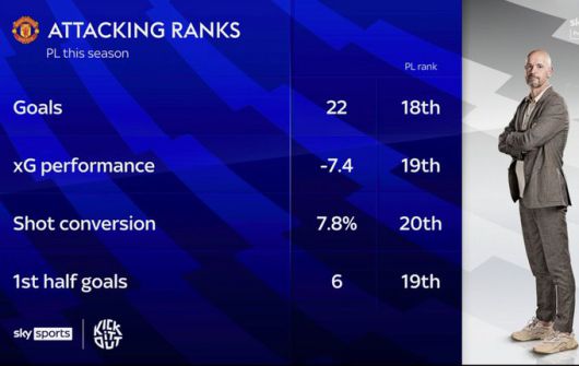 영국 스카이스포츠는 경기 직후 맨유의 이번 시즌 공격 지표가 최악이라고 소개했다. 팀 득점 22골(19위), 기대 득점 골득실 -7.4(19위), 슈팅 전환률 7.8%(20위), 전반전 득점 6골(19위)로 최악의 퍼포먼스다.