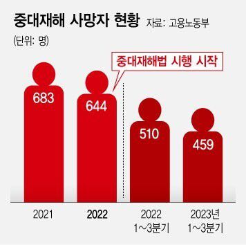 “시행 첫해인 2022년 중대재해 사망자가 644명으로, 한해전인 2021년의 683명에 비해 5.7%(39명) 줄었다.(고용노동부는 2021년 통계 미공개. 언론 취재로 보도됨.) 사망사고 건수 역시 8.1% 줄었다. 2023년에도 1~3분기 누적 사망자가 459명으로 2022년 1~3분기의 510명에 비해 10%(51명) 줄었다. 사망사고 건수는 7% 줄었다. 법시행 효과가 있다고 봐야 한다.
