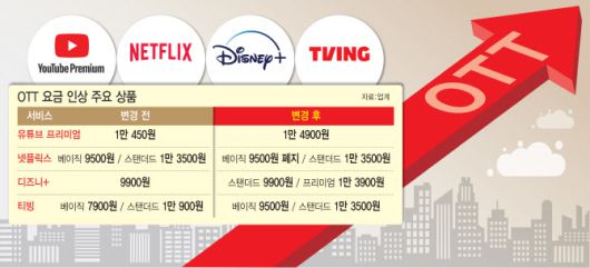 온라인동영상서비스(OTT) 요금이 급격하게 오르고 있다. 유튜브 프리미엄은 43% 인상, 디즈니플러스는 광고 없는 요금제를 40% 올렸으며, 티빙도 기본요금을 약 20% 인상했다. 넷플릭스는 광고 없는 가장 저렴한 상품(월 9500원)의 판매를 중단했다.