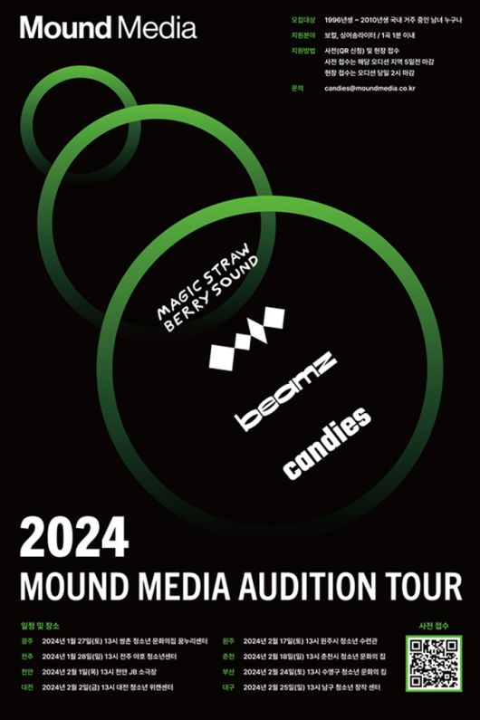 종합 엔터테인먼트 기업 마운드미디어가 오는 27일부터 2월 25일까지 ‘2024 마운드미디어 오디션 투어(2024 MOUNDMEDIA AUDITION TOUR)’를 개최한다고 2일 밝혔다.