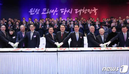 윤석열 대통령이 2일 서울 영등포구 중소기업중앙회에서 열린 2024년 경제계 신년인사회에서 경제계 인사들과 떡케이크를 자르고 있다. (대통령실 제공) 2024.1.2/뉴스1 ⓒ News1 오대일 기자 |