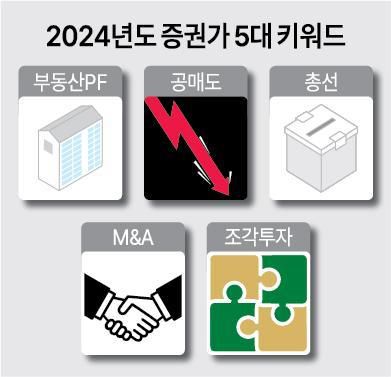 2일 업계에 따르면 올해 증권가 분위기를 좌우할 5대 키워드로 △‘부동산 프로젝트파이낸싱(PF)’ 부실 △불법(무차입) 공매도 △제22대 국회의원 선거(총선) △인수합병(M&A) △조각투자가 꼽힌다.