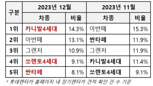 개인 고객의 SUV 선호는 지난해부터 뚜렷하게 나타나고 있다. 특히 카니발은 개인 고객이 선택한 신차 장기렌터카 톱3에 매년 포함되는 인기 차량으로, 최근 부분변경 및 하이브리드 모델이 출시되어 2024년에도 그 인기가 지속될 것으로 예상된다. 실제로 카니발은 지난 12월 롯데렌터카 마이카 전체 견적 건수 중 14.3%를 차지하며 견적 순위 1위에 올랐으며, 전월 대비 순위가 4위에서 1위로 3단계 상승했다. 새로 출시된 카니발 하이브리드는 13.5㎞/L의 높은 연비로 실용성과 경제성을 모두 갖춰 다자녀 가족, 캠핑을 즐기는 고객에게 적합하다. 롯데렌터카 마이카 48개월 계약 시 월 36만원대에 신차 이용이 가능하다. 카니발에 이어 쏘렌토와 싼타페까지 총 3종의 SUV가 지난 12월 롯데런터카 마이카 견적 순위 톱5에 포함됐다.