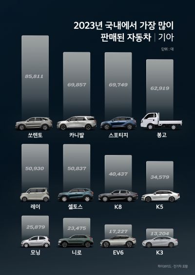 차종별 판매량은 쏘렌토가 8만5811대(하이브리드 5만7109대 포함)로 브랜드 내에서 가장 높은 판매고를 올렸다. 지난해 페이스리프트를 거치면서 인기가 더욱 늘어난 모습이다. 카니발과 스포티지는 각각 6만9857대(하이브리드 1815대), 6만9749대(하이브리드 3만2354대)로 뒤를 이었다. 2번의 페이스리프트를 거치고 중국산 리튬인산철 배터리를 탑재해 국내 저가 전기차 시장을 개척한 레이는 5만930대로 전년(4만4566대) 대비 14.3% 늘어난 판매량을 기록했다. 다만 레이 전기차 판매대수는 3727대로 레이 전체 판매량에 큰 영향을 미치진 않았다. 셀토스는 5만837대로 5위에 올랐다. 레이와 마찬가지로 시간이 지날수록 높은 인기를 얻고 있다. 2022년(4만3095대) 대비 18.0% 늘어난 성장률을 보였다.