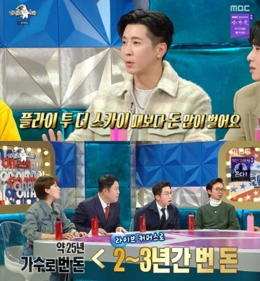 그러면서 "플라이 투 더 스카이 때보다 돈을 많이 번다. 2~3년 동안 번 돈이 25년간 가수로 번 돈보다 훨씬 많다"고 해 놀라움을 안겼다.