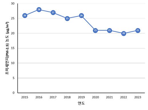 4일 경기도보건환경연구원에 따르면 지난해 도내 초미세먼지 연평균 농도는 2023년 21μg/㎥로 2022년 20μg/㎥대비 소폭 증가했다. 경기도 내 초미세먼지 연평균 농도는 2018년 28μg/㎥로 최고 수위를 기록한 후 계속 감소세를 보이면서 2021년 21μg/㎥, 2022년 20μg/㎥까지 낮아졌었다. 도내 초미세먼지는 31개 시군 110개 도시대기측정소에서 측정했으며 올해 상반기까지 국립환경과학원 검토를 거쳐 최종 확정한다.