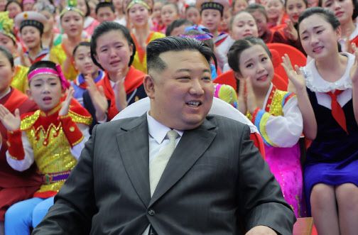 북한 김정은 노동당 총비서가 1일 만경대학생소년궁전에서 열린 학생소년들의 설맞이공연을 관람하고 기념사진을 촬영했다고 당 기관지 노동신문이 2일 보도했다. 김 총비서가 학생소년들에게 둘러싸여 있다.(사진=평양노동신문, 뉴스1) |