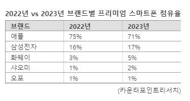 브랜드별 프리미엄 스마트폰 점유율을 보면 애플이 지난해 71%로 가장 높다. 2022년 대비 4%포인트 감소했지만, 여전히 압도적인 수치다. 같은 기간 삼성전자의 프리미엄 스마트폰 점유율은 16%에서 17%로 1%포인트 개선됐다. 그 뒤를 점유율 5%(2022년 3%)를 기록한 화웨이가 이었다.