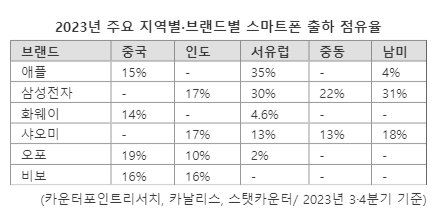 중국은 삼성전자에게 여전히 과제로 남아 있다. 자국 및 애플의 브랜드 강세가 지속되면서 삼성의 점유율 반등도 어려울 것이란 평가가 지배적이기 때문이다. 지난해 화웨이의 프리미엄 스마트폰 점유율 개선도 중국 시장에서 화웨이의 플래그십 라인업 화웨이 메이트60이 애플의 수요를 흡수한 것으로 해석된다.