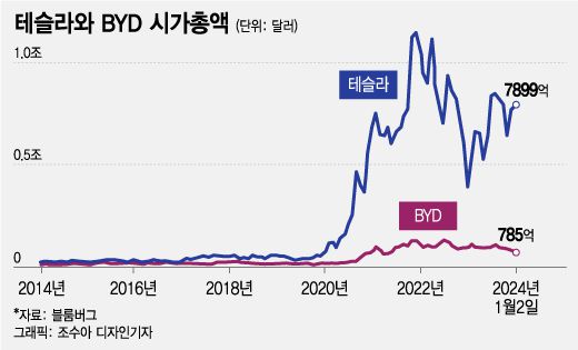 주목할 점은 비야디가 테슬라를 앞서 세계 1위의 전기차회사에 올랐음에도 시가총액은 테슬라의 10분의 1 수준에 불과하다는 것이다.