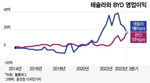 그렇다고 비야디의 영업이익이 테슬라에 크게 뒤쳐지는 것도 아니다. 지난해 3분기 비야디의 영업이익은 17억달러로 18억달러인 테슬라를 바짝 추격했다.