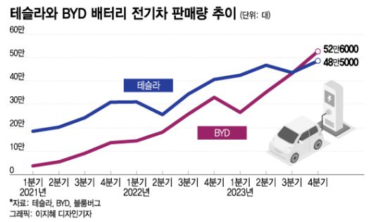중국의 비야디(BYD)는 지난해 4분기에 52만6000대의 전기차를 판매했다. 이는 같은 기간 테슬라의 전기차 인도량 48만5000대를 앞서는 것이다. 배터리형 전기차시장에서 테슬라가 1위 자리를 뺏기기는 이번이 처음이다.