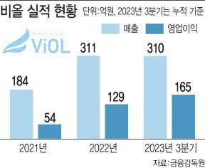 3일 의료기기와 증권업계에 따르면 비올은 올해 3분기 매출과 영업이익이 각각 310억원, 165억원을 기록했다. 이는 전년 동기 대비 각각 50.9%, 103.7% 증가한 수치다. 올해 3분기 매출은 지난해 연간 실적에 근접했다. 영업이익은 이미 지난해 연간 실적을 뛰어넘었다. 현 추세대로라면 비올은 올해 증권사 컨센선스(전망치·IBK투자증권)인 매출 440억원, 영업이익 233억원을 무난히 달성할 전망이다. 비올은 매출과 영업이익 모두 사상 최대치를 또 경신하는 셈이다.
