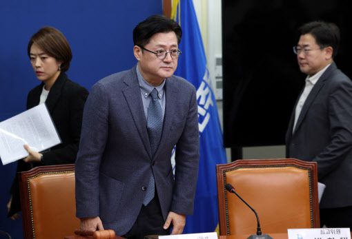 홍익표(가운데) 더불어민주당 원내대표가 5일 오전 서울 여의도 국회에서 열린 최고위원회의에 참석하고 있다. 왼쪽부터 고민정 최고위원, 홍 원내대표, 박찬대 최고위원.(사진=뉴시스) |