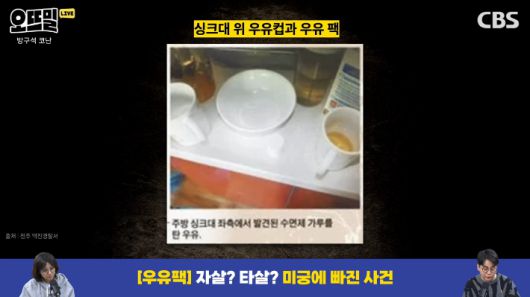 ◆ 서정암> 그렇죠. 경찰도 역시 그렇게 판단을 합니다. 일단 상황만 봐서는 동반자살 느낌이 나니까요. 그런데 현장을 좀 더 살펴보니까 두 번째 단서가 나옵니다. 우유팩입니다. 주방 싱크대 한쪽에 먹다 만 우유 컵과 우유팩이 발견이 됐는데요. 이 우유팩 여러분 잘 기억하시고요. 가스레인지 쪽에는 번개탄 빈 봉지가 하나가 발견됩니다. 그런데 이 집 안에 외부 침입 흔적도 없고요. 유서도 없었어요. 그리고 구축 아파트라 엘리베이터도 없고 CCTV도 없어서 누가 오고 갔는지 확인하기도 어려운 상황이었습니다.