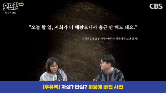 ◇ 채선아> 이 문자가 새벽 2시쯤 오고 오전 11시쯤에 사장 부부 시신이 발견된 거잖아요. 새벽 사이에 뭔 일이 있었다는 건데 제가 추측하기로는 2시 전에 무슨 일이 나고 범인이 대신 사장님의 휴대폰을 이용해서 직원들한테 문자를 보낸 건 아닐까라는 생각이 드네요.