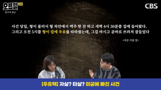 ◆ 서정암> 그렇죠. 지금 모든 게 큰아들이 범인 쪽을 가리키고 있는데요. 여기서 큰아들 여자친구에게서 이상한 증언이 나옵니다. 큰아들의 여자친구는 영어 강사여서 평소에 퇴근이 늦대요. 그래서 주로 밤에 차 안에서 데이트를 하는데 그날도 역시 차 안에서 데이트를 하고 있었대요. 그런데 갑자기 동생한테 전화가 와서 "형 나 형이랑 술 마시고 싶으니까 빨리 좀 와줘" 이랬대요. 그런데 여자친구가 좀 이상하다고 느꼈던 게 평소에 동생이 술 마시자 이런 얘기를 잘 안 하던 사람이래요.