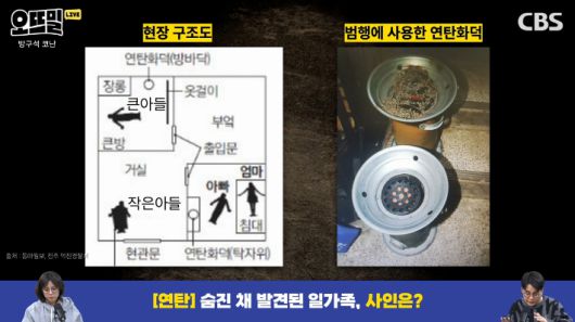 ◆ 서정암> 그렇죠. 아무래도 좀 그럴 수 있는데 역시나 사인은 일산화탄소 중독으로 인한 사망이었고요. 큰 방과 작은방에서 각각 화덕이 있었다고 합니다. 그리고 아들들이 있던 큰 방에는 옷장 뒤에서 이 화덕이 이렇게 발견이 됐는데 큰아들은 냄새를 좀 피하려고 했던 것 같아요. 창문 쪽을 향해서 엎드려 있는 자세로 쓰러져 있었다고 합니다.