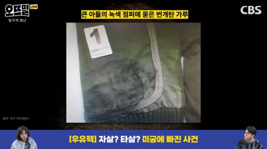 ◆ 서정암> 그렇죠. 그리고 큰아들의 녹색 점퍼 주머니에서 번개탄 가루가 발견됩니다.
