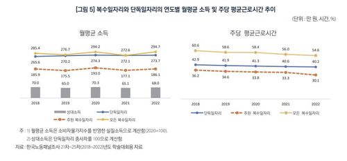복수 일자리 종사자들이 주업에서 버는 월평균 소득(실질소득 기준)은 2022년 기준 186만1천원으로, 단독 일자리 종사자(273만7천원)의 68%에 그쳤다. 근로시간 역시 주 평균 30.1시간으로, 단독 일자리 종사자(40.2시간)에 비해 10시간 정도 짧았다.