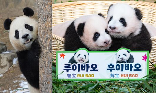 판다가 쌍둥이를 낳을 확률은 40~50%. 한 마리도 태어나기 어려운 자이언트판다 특성상 지난해 쌍둥이 탄생은 또 다른 의미로 기적이었다. 쌍둥이 판다는 탄생 100일을 맞아 대국민 투표를 통해 각각 슬기로운 보물, 빛나는 보물이라는 뜻의 루이바오, 후이바오라는 이름이 생겼다.