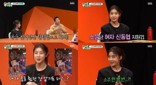 이날 서장훈은 "하지원의 별명이 '여자 신동엽'이라더라"고 운을 뗐다. 이어 신동엽은 "얼마 전에 유튜브 촬영을 했는데 굉장히 털털하고 솔직해서 이슈가 됐다"고 덧붙였다.