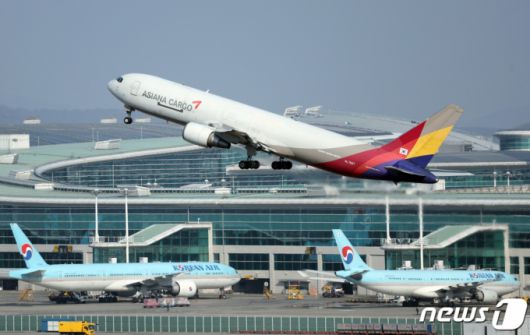 지난달 26일 오후 인천국제공항 계류장에 대한항공과 아시아나항공의 항공기가 지나고 있다. /사진=뉴스1 |