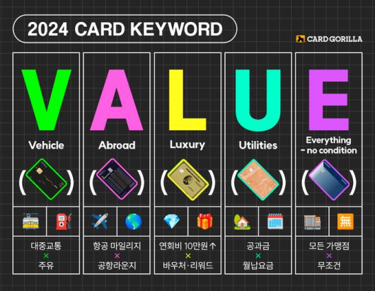 국내 최대 신용카드 플랫폼 카드고릴라가 2024년 신용카드 키워드로 ‘VALUE’를 선정했다. VALUE는 교통(Vehicle)·해외여행(Abroad)·프리미엄(Luxury)·공과금(Utilities)·무조건(Everything - no condition)의 앞글자를 땄다.