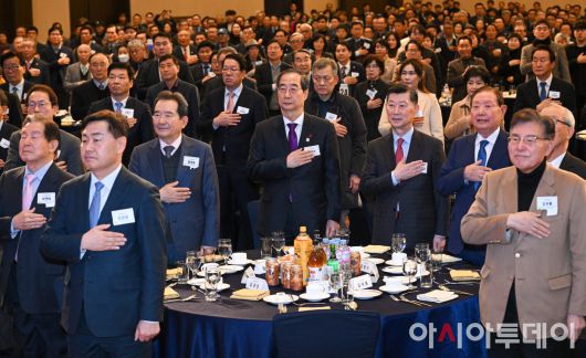 한덕수 국무총리와 김관영 전북지사 등 참석자들이 8일 오후 서울 서초구 더케이호텔 서울에서 열린 '2024 5백만 전북인 신년인사회'에서 국민의례를 하고 있다. 왼쪽부터 시계방향 김관영 전북지사, 이연택 전 대한최육회장, 정세균 전 국무총리, 한덕수 총리, 김홍국 재경전북도민회장. /정재훈 기자