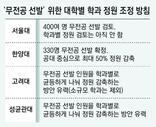 교육부가 2025학년도 대학입시에서 전공 구분 없이 신입생을 선발하는 ‘무전공 선발’을 확대하겠다고 밝히면서 대학들은 어떻게 무전공 선발 정원을 확보할지 고민 중이다. 한양대는 학생들이 몰리는 공대 인기 학과를 중심으로 정원을 줄이겠다는 방침을 정했지만, 고려대와 성균관대 등은 모든 학과에서 균등하게 정원을 줄이는 방안을 검토 중이다.