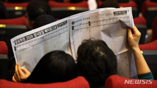 [서울=뉴시스] 김선웅 기자 = 지난해 12월10일 서울 종로구 성균관대학교 600주년 기념관에서 열린 종로학원 개최 2024 정시지원 변화 및 합격선 예측, 합격전략 설명 대입설명회에서 참석 학부모 및 수험생들이 배치참고표를 살펴보고 있다. 2024.01.09. photo@newsis.com |