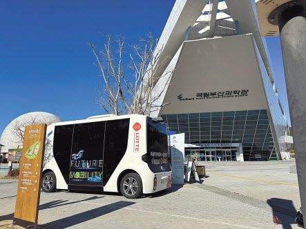 국립부산과학관에서 롯데정보통신 자율주행셔틀이 운행하고 있다. [롯데정보통신 제공] |