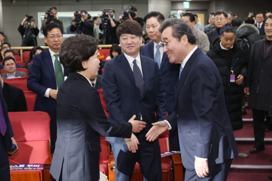 이낙연 전 더불어민주당 대표와 한국의희망 양향자 대표가 9일 국회 의원회관에서 열린 양 대표의 출판기념회에서 인사하고 있다. 이준석 전 국민의힘 대표가 두 사람이 인사하는 모습을 보며 웃고 있다. 연합뉴스 |