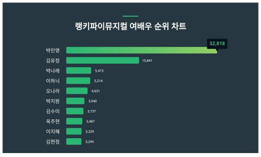 순위 키워드 트랜드지수 10대 20대 30대 40대 50대 1 박민영 32,818 7% 24% 31% 24% 14% 2 김유정 15,841 14% 23% 22% 24% 17% 3 박나래 5,413 7% 17% 26% 27% 23% 4 이하늬 5,214 6% 19% 27% 28% 20% 5 오나라 4,631 5% 17% 26% 29% 23% 6 박지원 3,940 6% 17% 20% 21% 37% 7 김수미 3,737 3% 12% 20% 25% 40% 8 옥주현 3,487 4% 15% 27% 37% 17% 9 이지혜 3,329 6% 19% 22% 24% 29% 10 김현정 3,294 8% 20% 22% 23% 28% [출처: 랭키파이 인물 뮤지컬 여배우 트렌드 테이블]