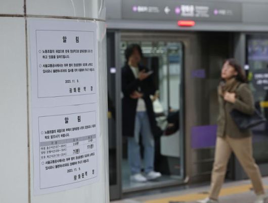 지난해 11월 서울 종로구 광화문역 지하철 승강장에 서울교통공사 노조 파업 관련 안내문이 붙어있다. 연합뉴스 |