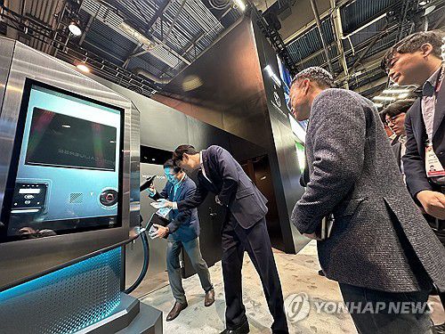 (라스베이거스=연합뉴스) 오규진 기자 = 신동빈 롯데그룹 회장의 장남인 신유열 롯데지주 미래성장실장이 세계 최대 가전·정보기술(IT) 전시회 CES 2024가 막을 올린 9일(현지시간) 미국 라스베이거스 컨벤션센터(LVCC) 센트럴홀 롯데정보통신 부스를 방문해 오영식 이브이시스 대표로부터 전기차 충전기 관련 설명을 듣고 있다 2024.1.10