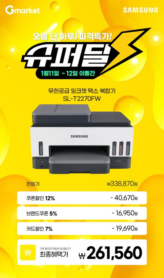 [smartPC사랑=임병선 기자] 지마켓에서 1월 삼성 메가브랜드위크 프로모션 슈퍼딜 특가 행사로 삼성전자 정품무한 컬러 잉크젯복합기 인기 모델 SL-T2270FW 특가 행사를 진행한다.