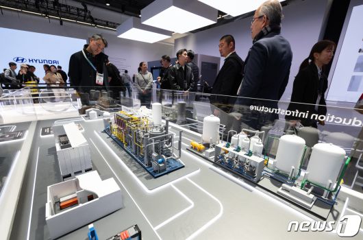 (라스베이거스(미국)=뉴스1) 이재명 기자 = 세계 최대 가전·IT(정보기술) 전시회 'CES 2024' 개막 첫 날인 9일(현지시간) 미국 네바다주 라스베이거스 컨벤션센터(LVCC)에 마련된 현대차 전시관을 찾은 관람객들이 수소 생태계 관련 전시물을 살펴보고 있다. 2024.1.10/뉴스1